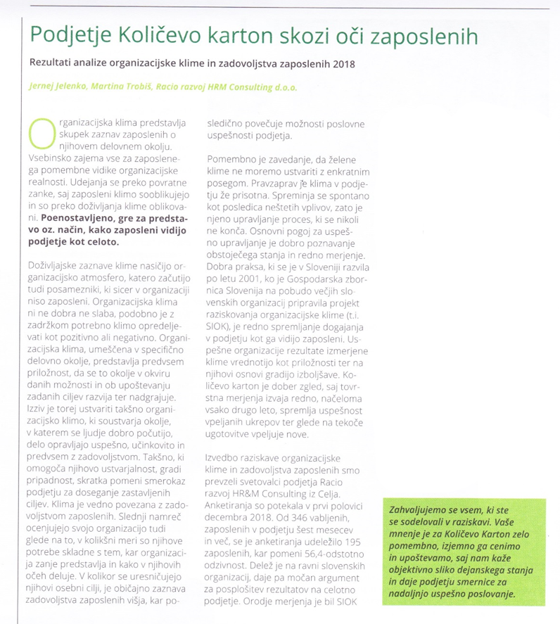 Ukvarjanje z organizacijsko klimo pomeni celovit proces od ugotavljanja trenutnega stanja, načrtovanja in vpeljave ukrepov izboljšav do spremljanja njihovih učinkov s ponovnim merjenjem. Temelj njenega učinkovitega upravljanja je vključenost vseh zaposlenih, v začetku s seznanitvijo namena in ciljev merjenja ter v nadaljevanju predvsem z rezultati. Eden izmed kanalov obveščanja, ki doseže vse sodelavce podjetja, je interni časopis. Poslužili so se ga tudi v Količevo karton, za katerega smo izvajalci projekta pripravili povzetek ključnih ugotovitev raziskave organizacijske klime (v nadaljevanju prikazujemo izsek).